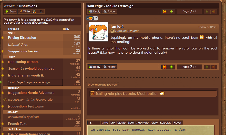 Y esto es grosso modo mi opinión de mush de twinoid, o al menos sus defectos, si bien es cierto que me enganchó una temporada ahora mismo me estoy planteando borrarlo y eliminarlo de la barra de favoritos(y no volver a ponerlo de vuelta), honestamente, el aliciente social pierde mucho cuando los trolls entran en escena. Y es su punto fuerte, por el resto llama poco.